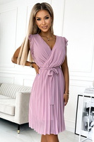 393-2 ROSALIA Kobieca sukienka z kopertowym dekoltem i kokardkami - PUDROWY RÓŻ