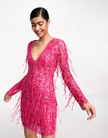 WYPOŻYCZENIE - sukienka FUXY mini dopasowana z długim rękawem, głębokim dekoltem i frędzlami - fuksja