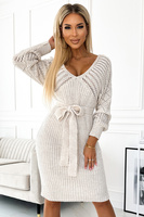 507-3 Ażurowa sweterkowa sukienka z dekoltem i wiązaniem - CZEKOLADOWA