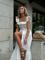 YOSEE - sukienka z falbankami mini rozkloszowana z wiązanymi ramiączkami - biała