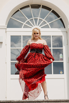 WYPOŻYCZENIE - sukienka CASIDEA czerwona panterka z bufiastymi rękawami