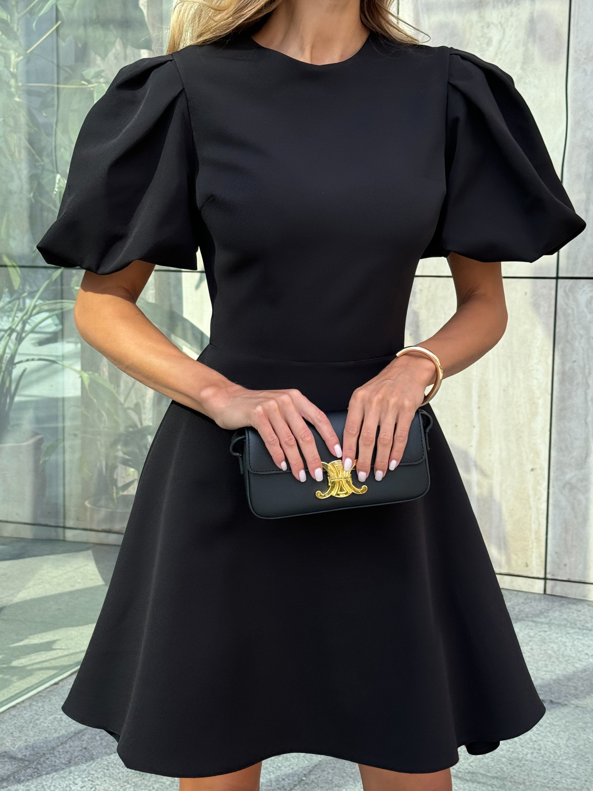 LUX MINI EX - elegancka rozkloszowana sukienka mini z krótkimi bufiastymi rękawami - czarna