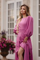 PRZYMIARKA - sukienka MALL elegancka i wyrafinowana z garniturowej tkaniny klasy PREMIUM, dopasowana midi z bufiastymi rękawami, z rozcięciem na nogę - różowa